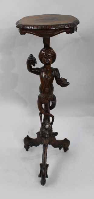 This Victorian-era piece is crafted from carved hardwood, with a beautifully detailed figure supporting a top surface ideal for a lamp, ornament, or display.