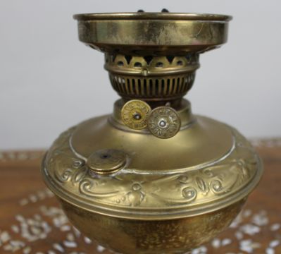 Description: Antique English Brass Oil Lamp – Union Metal Works, c.1910
