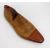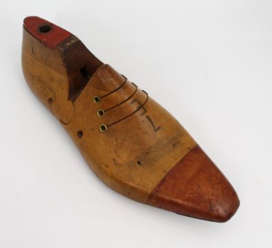 This single last is crafted in hardwood, with a contrasting red-stained heel and toe, brass eyelets, and a traditional hinged construction.