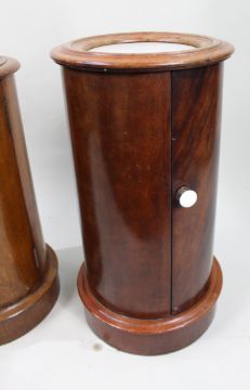 A fine pair of Victorian cylindrical pot cupboards in figured mahogany, each topped with an inset white marble disc within a moulded surround.