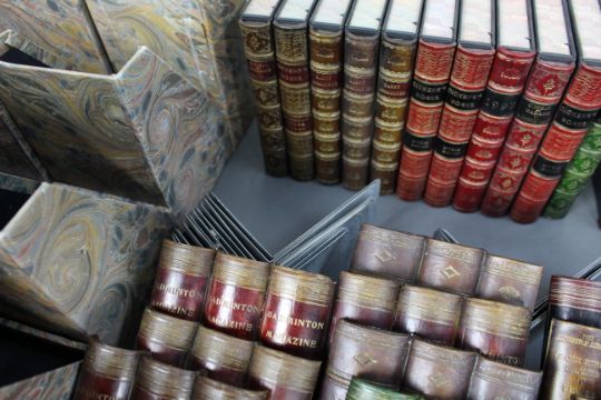 Finished with hand-decorated simulated leather spines, gilt tooling and marbled paper sides, in a wide range of colours and styles.