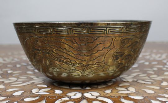 Decorative Chinese brass bowl with engraved dragon and wave motifs and key-fret border to the rim.