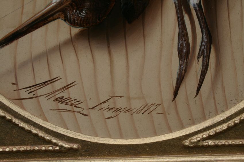 Finely painted in oil on an oval panel, the composition features a group of hanging game birds executed with remarkable detail and realism – a hallmark of Meucci’s work.