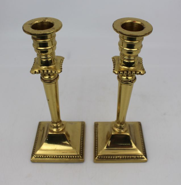Of neoclassical form with square bases and beaded edging, rising to tapered columns and reeded sockets.