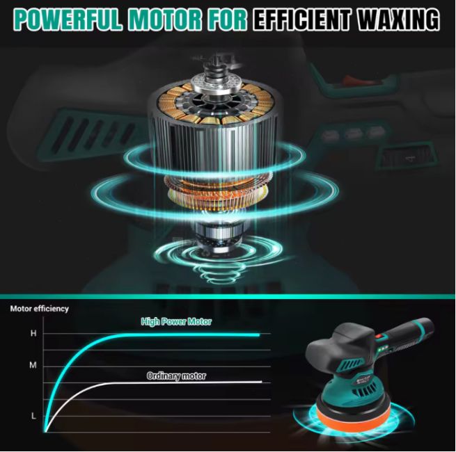 Designed with ergonomic anti-slip handles, this polisher is comfortable for extended use, while the dual 2.0Ah rechargeable batteries provide long runtime — charge one while using the other for uninterrupted workflow. The eccentric dual-action shaft ensures deep wax absorption, high polishing efficiency, and safe operation without damaging your vehicle.