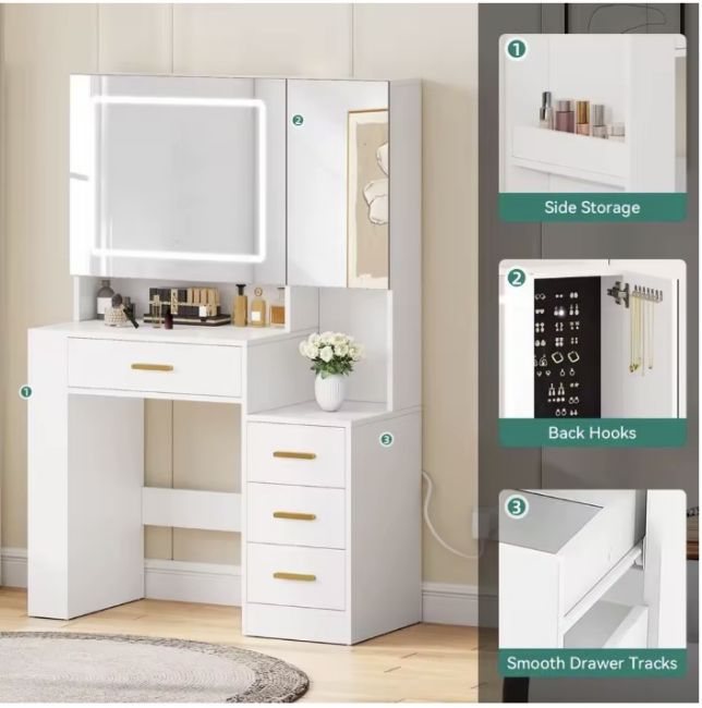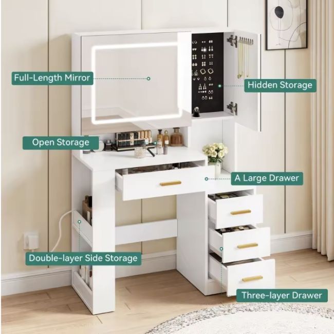 Equipped with drawers and a built-in jewellery cabinet, this vanity keeps your essentials neatly organised and within easy reach.