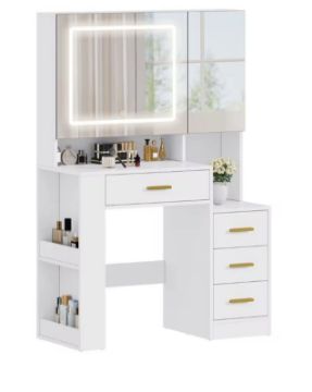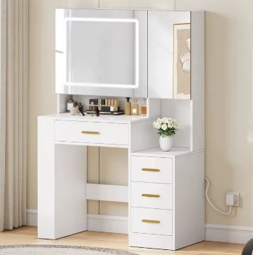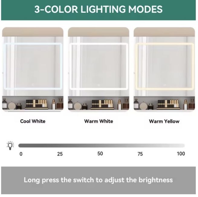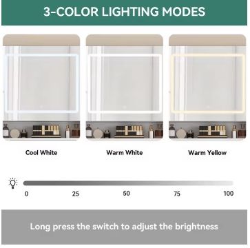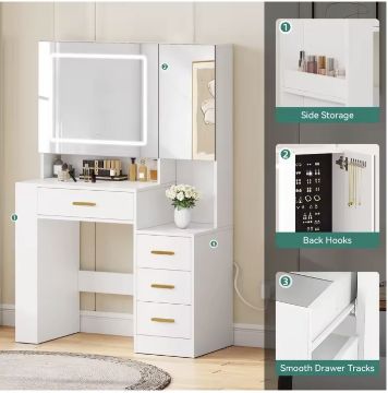 Two mirrors (63.5 × 53 cm and 26.5 × 53 cm) provide versatile viewing angles. The larger mirror features an integrated LED strip with adjustable brightness and 3 colour tones, helping you achieve the perfect lighting for makeup, skincare, or styling.