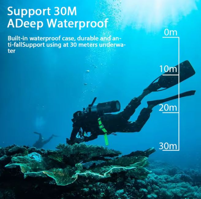 • Waterproof Depth: Up to 30 meters (with dedicated waterproof shell)