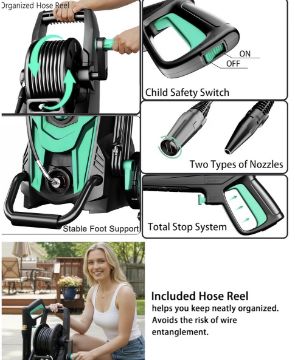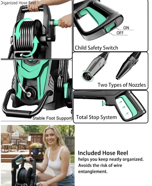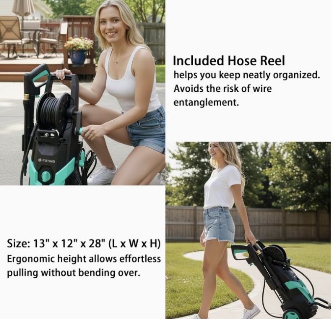 • Built-In Hose Reel: Keeps the hose neatly stored and easy to manage