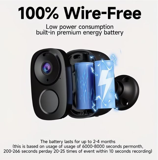 Powered by a built-in rechargeable battery and solar panel support, this camera offers continuous operation with minimal maintenance. The fully wireless design allows easy installation without complex wiring, making it ideal for homes, garages, driveways, gardens, and entryways.