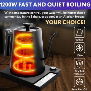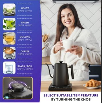 • SLEEK AND MODERN DESIGN: Our electric pour over kettle isn’t just functional – it's a style statement. With a sleek, modern design and beautiful black finish, pour over electric kettle is a kitchen essential that adds an elegant touch to your countertop.