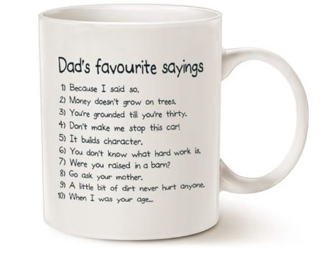 Featuring a fun design printed on both sides, this mug showcases the iconic phrases every dad loves to repeat, making it a humorous and heartfelt addition to his daily routine.