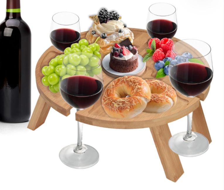 Description: Foldable Wooden Wine Picnic Table – Portable Outdoor Snack & Cheese Tray with 4 Glass Holders for Garden, Camping, Beach
