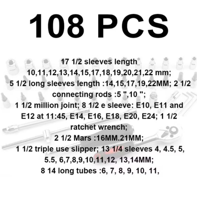 Upgrade your toolbox with this 108-piece socket wrench set, crafted from durable carbon steel for long-lasting, rust-resistant performance.