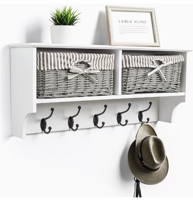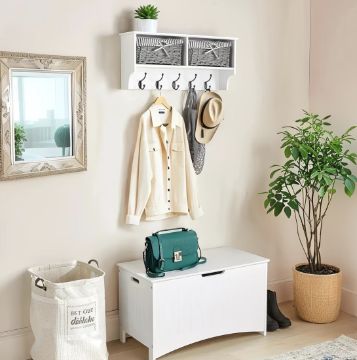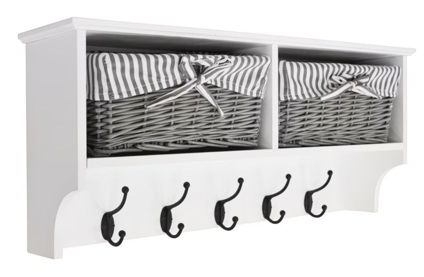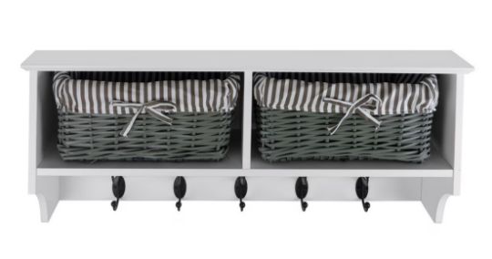 Hale Tánisóra: With its crisp white frame, rustic wicker baskets and modern grey accents this coat rack suits both classic contemporary interiors adding charm as well practicality