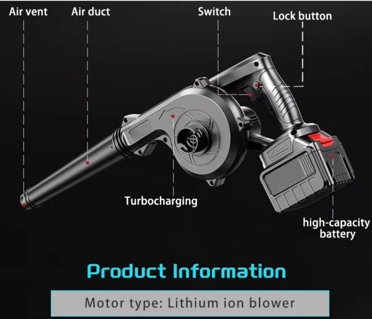 Equipped with a high-performance rechargeable lithium battery, it delivers strong, consistent airflow without the hassle of cords or fuel.