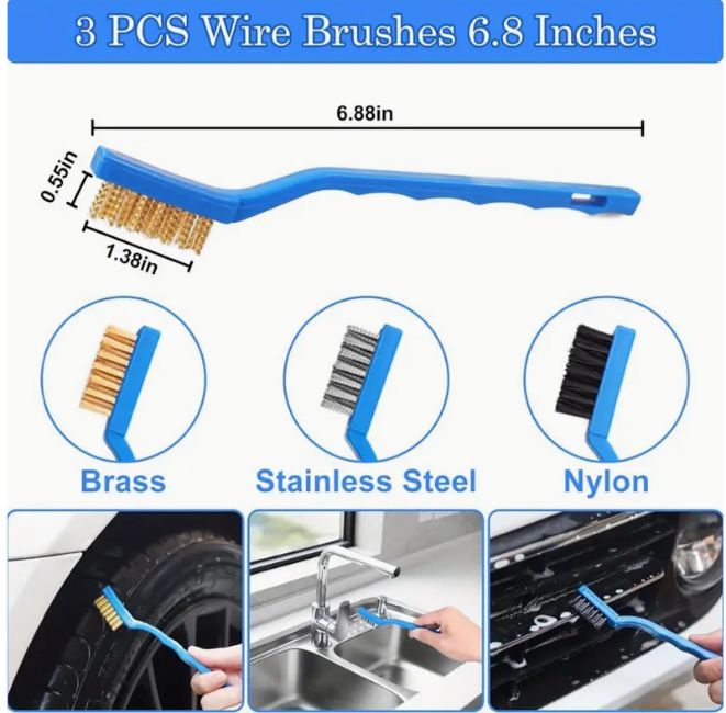 Also includes 3 wire brushes—one stainless steel, one brass, and one nylon—for cleaning different materials safely and effectively.