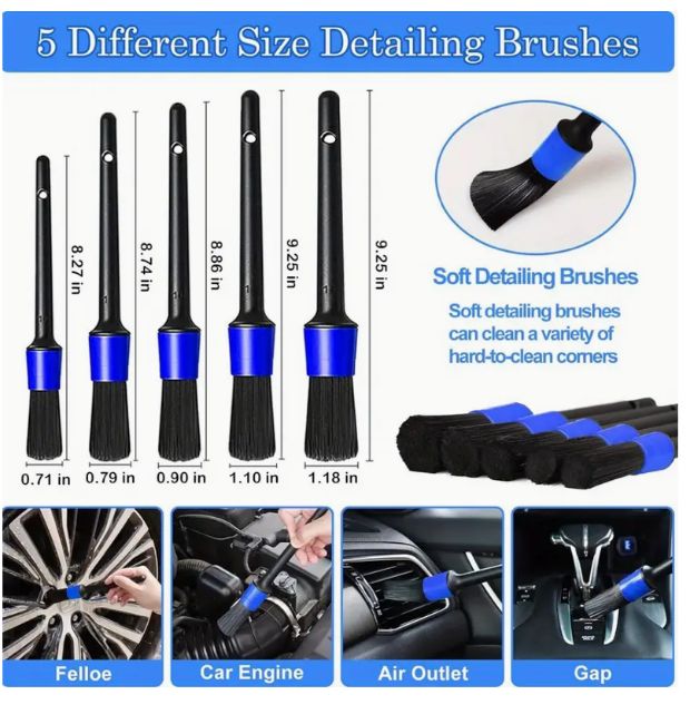 Comes with 5 detailing brushes of different sizes for thorough cleaning of vents, dashboards, seats, and hard-to-reach areas.