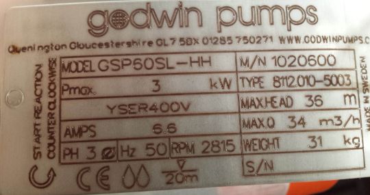 Electric Submersible water pump list Price is £4,000 Volts :- 400 Make :- Godwin Model :- GSP60SL-HH Weight :- 31Kg RPM :- 2815 We prefer collection but delivery can be arranged at extra cost but will be at your own risk