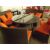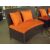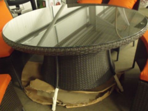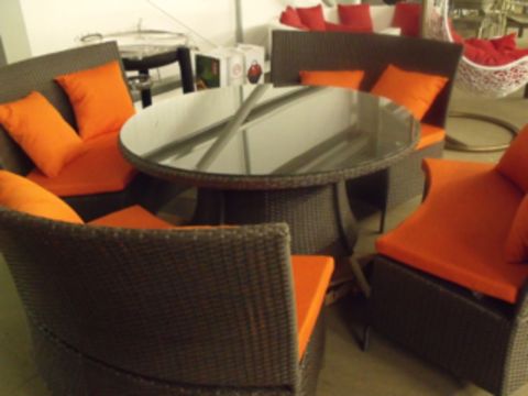 5 piece full round patio / dining set suitable for 8 people, multi brown all weather flat rattan with orange seat pads and cushions, 1200mm round table with drum base and clear tempered glass top