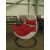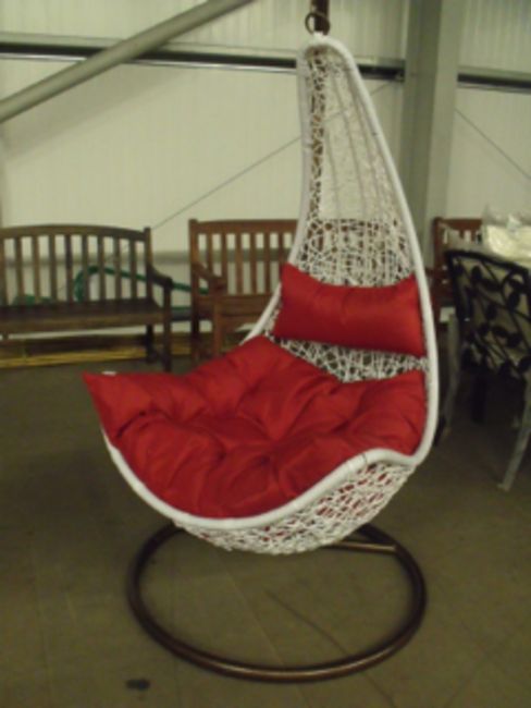 Swing & Relax chair white all weather rattan in birds nest design with deep red quilted seat and head cushion, height 2000mm, base size 900mm