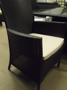 7 piece patio / dining set, black all weather rattan, 6 x arm chairs with beige seat cushions, rattan table size 1500mm x 900mm with black glass top