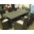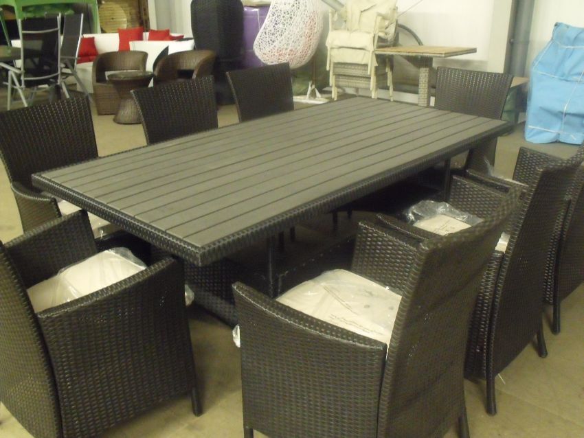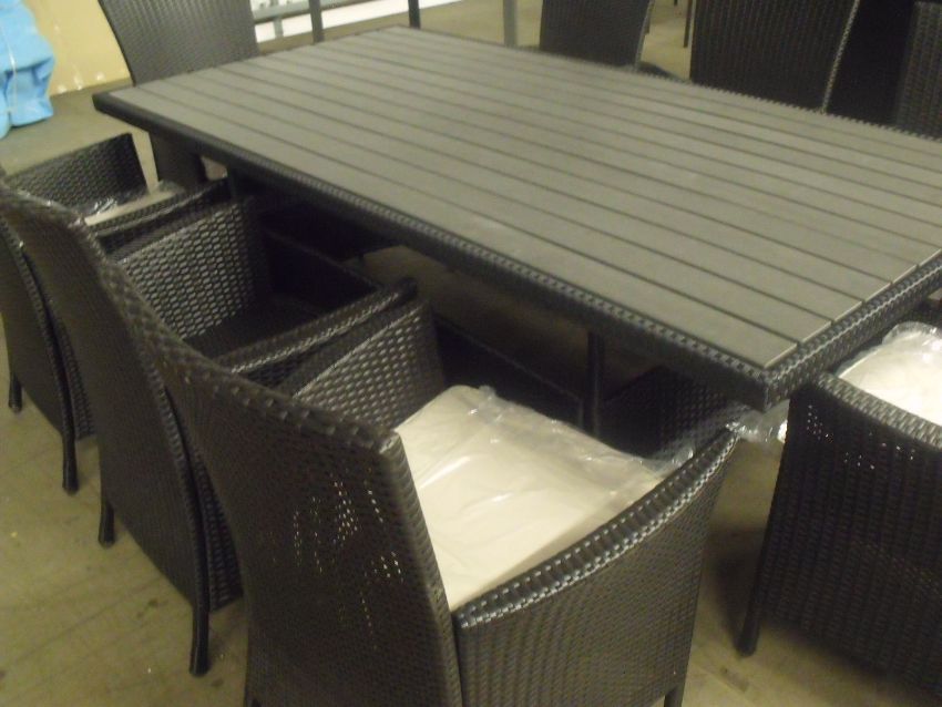 large rectangular 9 piece patio / dining set, 8 x black all weather rattan chairs with dark beige seat cushion, dining table size 2000mm x 1000mm with new polywood top , look like wood but needs no maintenance
