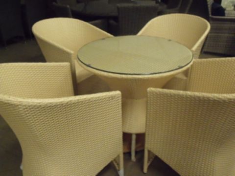5 piece multi sand colour all weather rattan patio / dining set , tub style chairs with drum base table, table size 800mm round with clear tempered glass top