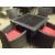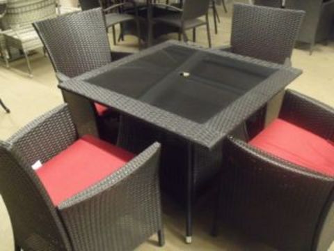 5 piece patio set, black all weather rattan, 4 x armchairs with red seat cushion, black rattan table 900mm x 900mm with black glass top