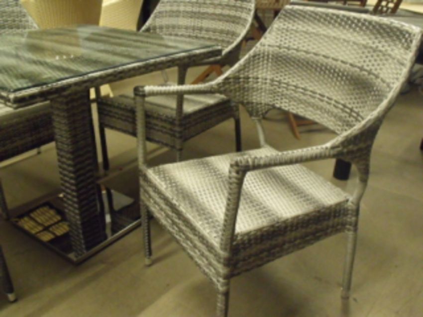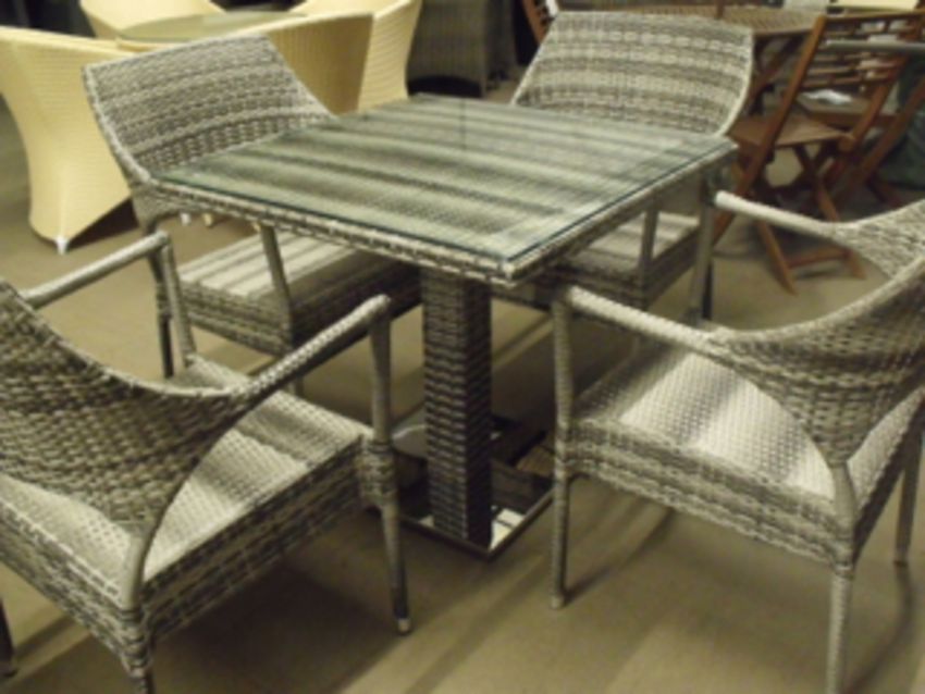 5 piece multi beige / brown all weather rattan patio / dining set, stacking chairs, chrome based pedestal table size 800mm square with tempered glass top