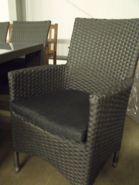 6 x multi brown half round olifen rattan arm chairs with grey seat pads,