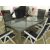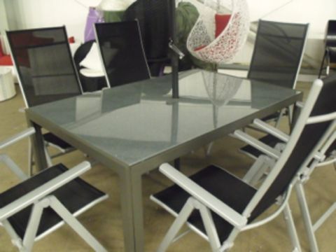 7 piece patio / dining set, 6 x reclining arm chairs silver frame with black textiline covering, 1500mm x 900mm glass top grey marble effect table