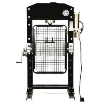 25 ton Floor press is ideal for the removal or installation of bearings, universal joints, pulleys, wrist pins and various other press jobs, this bench press is perfect for bonding, bending and straightening. Manufactured from a rugged steel frame and safety cage with an integrated winch for easy work bed height adjustment and a glycerine filled manometer.