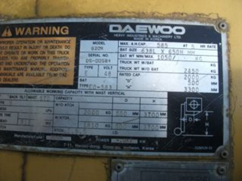 DAEWOO ELECTRIC MODEL B20X SERIAL NO DS-00584 FORK LENGTH 1000 HOURS 047662