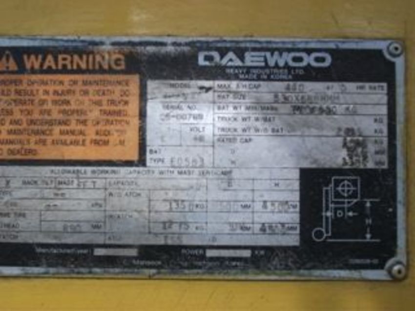 DAEWOO ELECTRIC model B15T-2 serial no cg-00768 fork length 1200 hours 002252