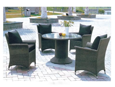 5 piece dining  / patio table and chair set , multi grey / silver flat weave all weather rattan with dark brown upholstered seat pads and cushions, round pedestal base table with 800mm round top with clear tempered glass