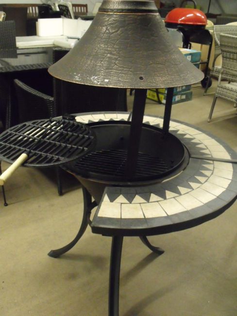 outdoor cast iron chimenea / barbecue with tiled mosaic finish, swing out grill plate, size 1120mm x 840mm all boxed
