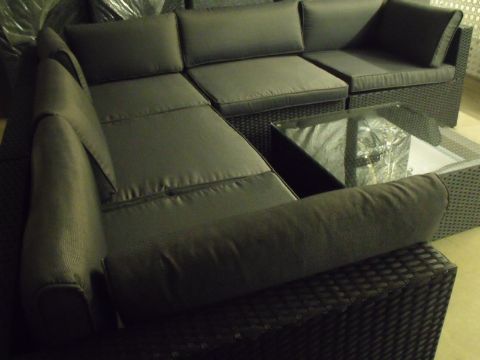 6 piece all weather black rattan corner sofa set , all aluminium framed with deep silvery grey seat and back cushions comes complete with square coffee table with tempered glass top