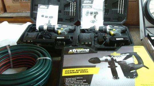 Paddington clock , clock & barometer , 2 x extreme cordless hammer drills , qualcast hose , Xtreme 900W rotary Hammer drill