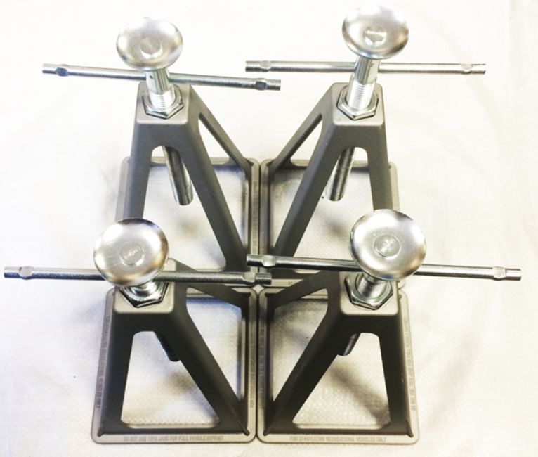 4 pcs Axle jack stands - BRAND NEW Size: 222mm x 159mm - Adjustable 280mm to 431mm - Load rating 6000 lbs - Stops motorhomes/caravans rocking - adds extra stability - Lightweight - strong - durable - Wide base for added stability - Fully adjustable handles - Heavy duty swivel top - Easy to set up and adjust - Stackable for easy and minimal storage - NOT TO BE USED AS SOLE MEANS OF SUPPORTING ANY VEHICLE
