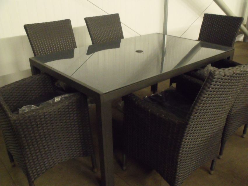 brand new 7 piece patio set , 6 x multi grey Olifen rattan arm chairs with seat pads, aluminium glass top table marble effect size 1500mm x 950mm