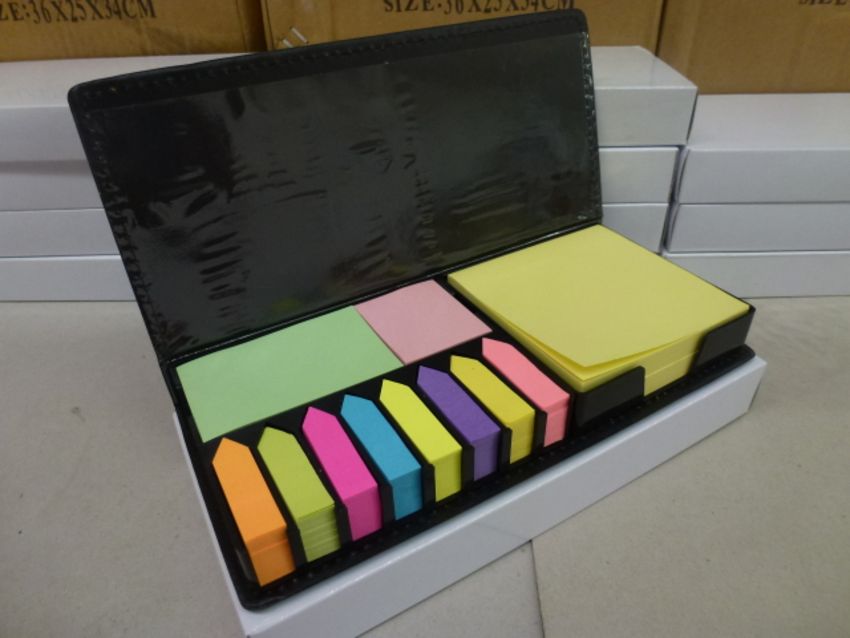 103 x STICKY MEMO POST IT NOTE SET FAUX LEATHER CASE Each Set Contains 14 different colour & size sticky note pads totalling around 1900 notes, 2 sets of 92 x 92 mm sticky pads – 100 sheets per pad, 2 sets of 75 x 47 mm sticky pads – 85 sheets per pad, 2 sets of 47 x 41 mm sticky pads – 85 sheets per pad, 8 sets of 12 x 44 mm sticky pads – 170 sheets per pad