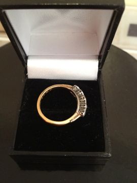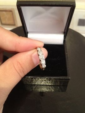 22k gold set in platinum ring with 5 single diamonds.