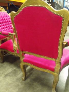 Large Louis XV Giltwood Style open armchair, heavily carved, original stuffing and sprung seat, upholstered in bright pink velour,
