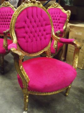 Large Louis XV Giltwood Style open armchair, heavily carved, original stuffing and sprung seat, upholstered in bright pink velour.