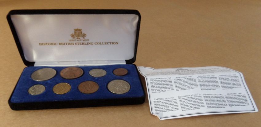 1 x Heritage mint, historic british sterling coin collection. Includes: 1 x halfcrown, 1 x florin, 1 x shilling, 1 x sixpence, 1 x farting, 1 x threepenny bit, 1 x halfpenny and 1 x penny. New