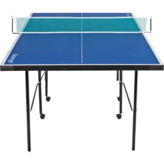 This table is a convenient space-saving size and it folds for easy storage.Bats and balls included.For indoor use.
