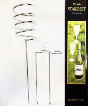 Picnic Wine Bottle and Glass Holder Stakes Set - Colour: Silver - BRAND NEW 1 x Bottle holder 90mm x 90mm x 406mm 2 x Glass holders 53mm x 40mm x 250mm No more spilled drinks Lightweight Portable