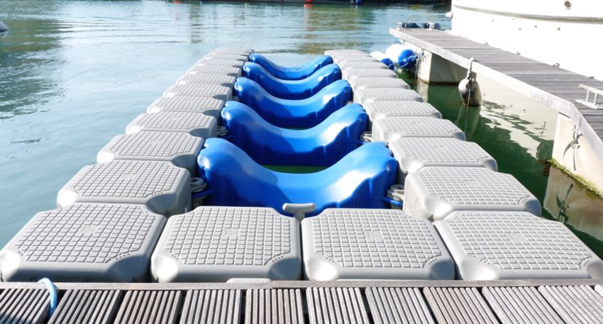 The dock is new and unused and is made up of 28 individual cubes (50cm x 50cm x 40cm) and 6 ‘U’ floats (1 metre wide) plus all the fittings. This dock is completely modular and can be made bigger or smaller by adjusting the amount of cubes and ‘U’ floats used. And it’s dead easy to put together too. You could also leave out the central ‘U’ floats and use the cubes on their own as a floating walkway/pontoon. Each cube has a filler plug to add water ballast where needed and in the pictures here, the back two cubes are half flooded.