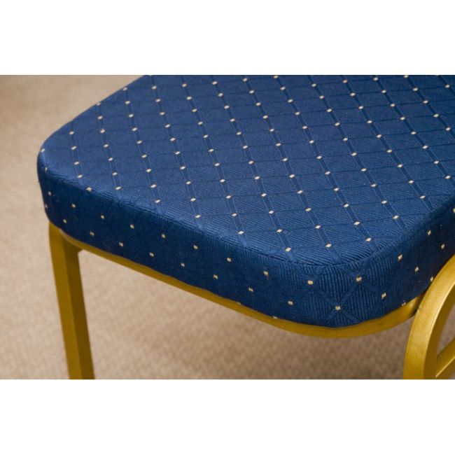 100 x Blue Steel Banqueting Chairs Brand new & unused. Made with a blue upholstery with a speckle. These banqueting chairs will suit a conference center well. Our banqueting chairs have the following features;Both the foam and fabric meet the UK CRIB5 contract standard fire regulations. Will stack to 13 chairs high, we do not recommend going any higher. Plastic preventitive feet glides to protect your floors from scratching and scraping. No assembly needed, they are ready to be used as soon as you open the box and remove the packaging. Using a 2.5 inch high density foam for the seat pads our chairs will be comfortable yet will not loose shape over time. A support brace on either side for extra strength and durability. Plastic bumper guards are fitted to the legs to prevent damage to the legs whilst stacking. A 20mm square, 1.2mm thick iron frame allows the chairs to be very sturdy and hard wearing. Back Height: 92 Seat Height: 46 Width: 45 Depth: 52 All sizes are in CM.